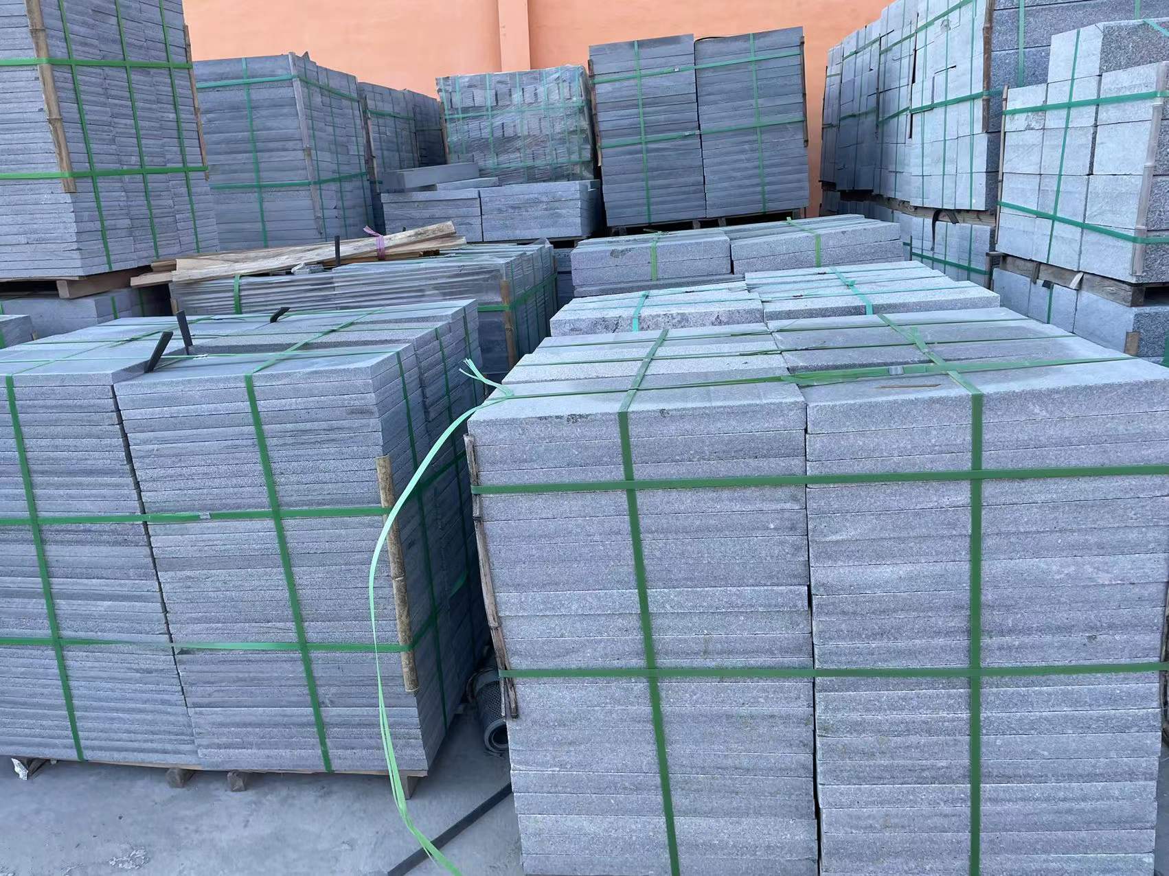 C級芝麻黑火燒面具有干燥條件下能見到少許的細白線、青甲線、黑疤、不太顯著的掃花、較為易察覺過水線。有些板材有伴有少許石膽。常用于廣場和園林的鋪地。